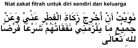 “Nawaytu An Ukhrija Zakaata Al-fitri Anni Wa An Jami’i Ma Yalzimuniy Nafaqatuhum Syar’an Fardhan Lillahi Ta’ala”
